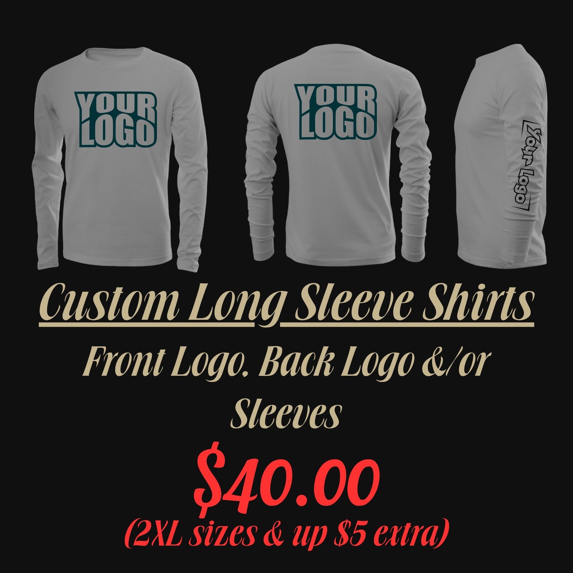 Send us your design and your color choice for your apparel to create your very own custom Long Sleeve Shirt! Design can include front lapel logo, large front logo, large back logo and/or one or both sleeves.