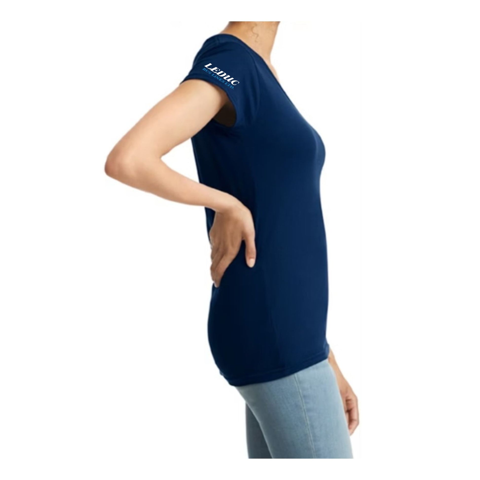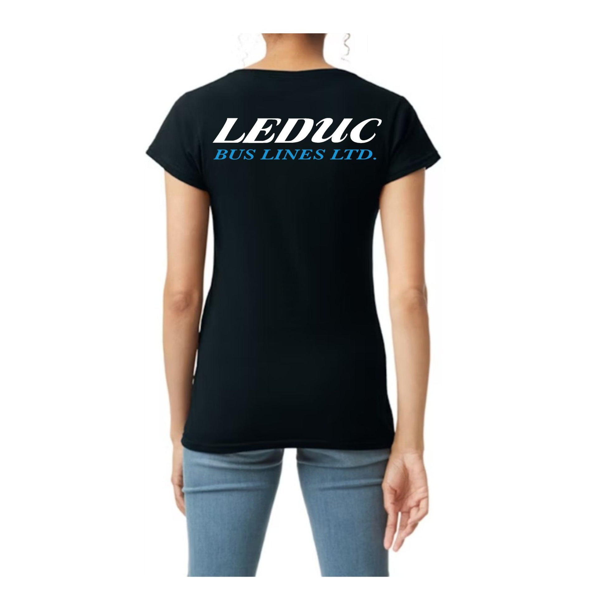 Ladies V-Neck T-Shirt with small Leduc Bus Lines lapel logo on front, small Leduc Bus Lines logo on the right sleeve and a large Leduc Bus Lines logo on the back.