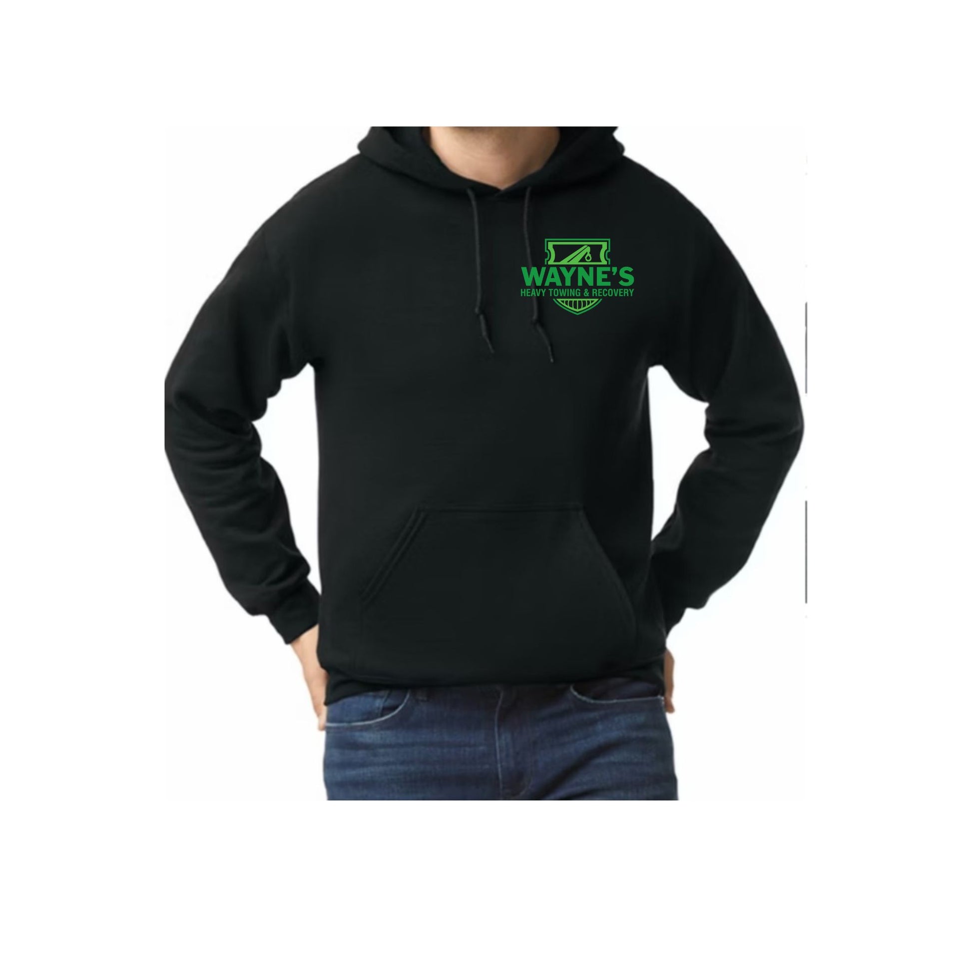 Wayne's Heavy Towing and Recovery Custom Hoodie with a small lapel logo on the front and big truck logo on the back.
